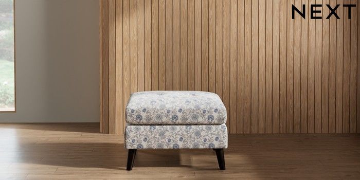 7.2.10 Buy Wilson Buttoned Back Footstool Relaxed Linen Look Print Woodblock Floral Blue Retro Tapered - Dark from the Next UK online shop Click here to use our accessible website