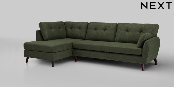 6.12.1 Buy Wilson Buttoned Back Large Corner Chaise - Left Hand Boucle Chenille Dark Moss Green Retro Tapered - Dark Brown from the Next UK online shop Click here to use our accessible website