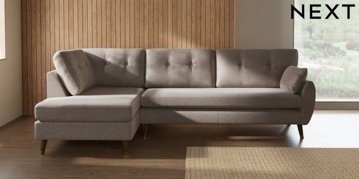 7.3.1 Buy Wilson Buttoned Back Large Corner Chaise - Left Hand Boucle Chenille Light Natural Low Retro Tapered Metal Cap - Mid from the Next UK online shop Click here to use our accessible website
