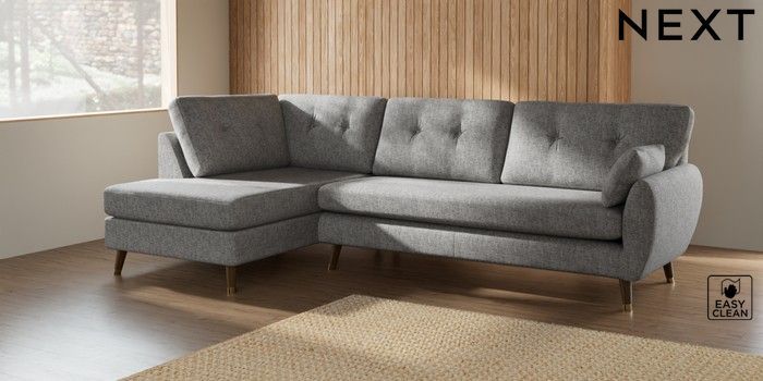 7.3.1 Buy Wilson Buttoned Back Large Corner Chaise - Left Hand Chunky Boucle Easy Clean Light Grey Low Retro Tapered Metal Cap - Mid from the Next UK online shop Click here to use our accessible website