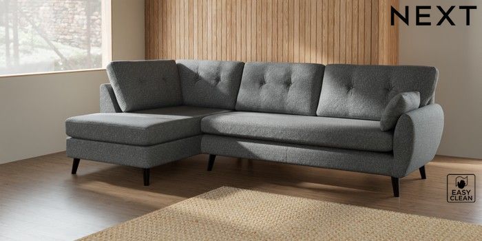 7.2.10 Buy Wilson Buttoned Back Large Corner Chaise - Left Hand Chunky Boucle Easy Clean Mid Grey Retro Tapered - Dark from the Next UK online shop Click here to use our accessible website