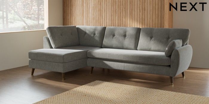 7.2.10 Buy Wilson Buttoned Back Large Corner Chaise - Left Hand Chunky Chenille Light Grey Low Retro Tapered Metal Cap - Mid from the Next UK online shop Click here to use our accessible website