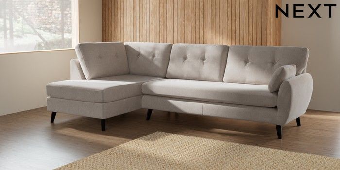 7.2.10 Buy Wilson Buttoned Back Large Corner Chaise - Left Hand Chunky Chenille Oyster Retro Tapered - Dark from the Next UK online shop Click here to use our accessible website
