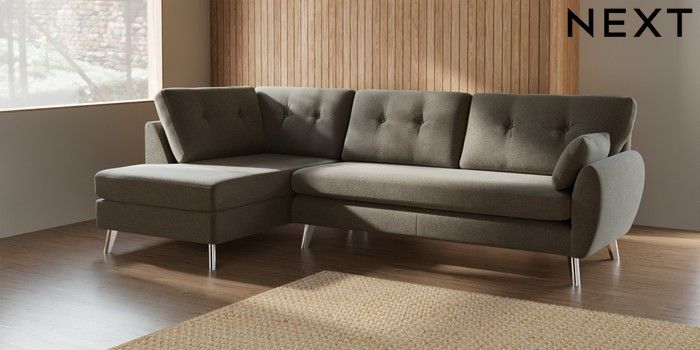 7.3.1 Buy Wilson Buttoned Back Large Corner Chaise - Left Hand Chunky Marl Light Olive Green Metal Tapered - Chrome from the Next UK online shop Click here to use our accessible website