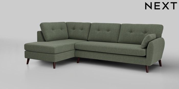 6.12.1 Buy Wilson Buttoned Back Large Corner Chaise - Left Hand Chunky Texture Mid Forest Green Retro Tapered - Dark Brown from the Next UK online shop Click here to use our accessible website