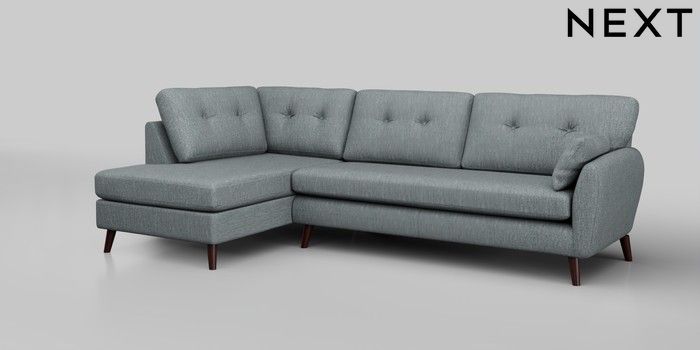 6.12.1 Buy Wilson Buttoned Back Large Corner Chaise - Left Hand Chunky Weave Mid Blue Retro Tapered - Dark Brown from the Next UK online shop Click here to use our accessible website