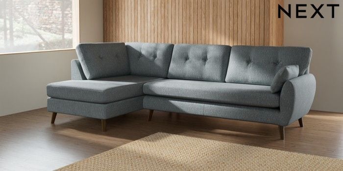 7.2.10 Buy Wilson Buttoned Back Large Corner Chaise - Left Hand Chunky Weave Mid Blue Retro Tapered - Mid from the Next UK online shop Click here to use our accessible website