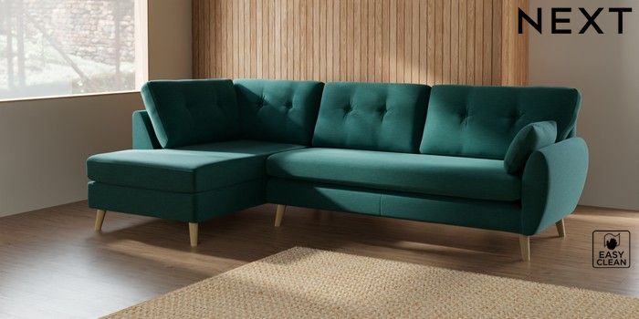 7.2.10 Buy Wilson Buttoned Back Large Corner Chaise - Left Hand Fine Chenille Easy Clean Dark Juniper Green Retro Tapered - Light from the Next UK online shop Click here to use our accessible website