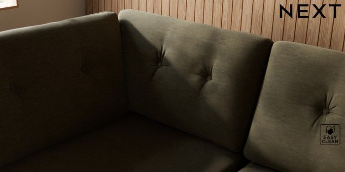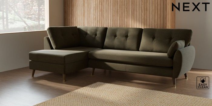 7.3.1 Buy Wilson Buttoned Back Large Corner Chaise - Left Hand Fine Chenille Easy Clean Dark Moss Green Low Retro Tapered Metal Cap - Mid from the Next UK online shop Click here to use our accessible website