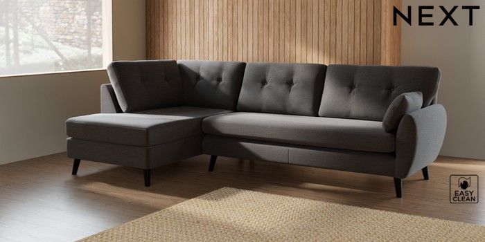 7.2.10 Buy Wilson Buttoned Back Large Corner Chaise - Left Hand Fine Chenille Easy Clean Dark Smoke Grey Retro Tapered - Dark from the Next UK online shop Click here to use our accessible website