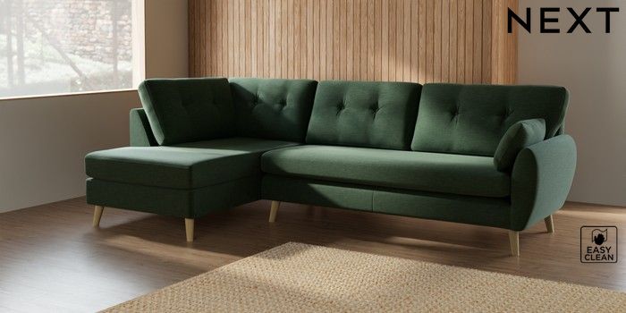 7.2.10 Buy Wilson Buttoned Back Large Corner Chaise - Left Hand Fine Chenille Easy Clean Mid Khaki Green Retro Tapered - Light from the Next UK online shop Click here to use our accessible website
