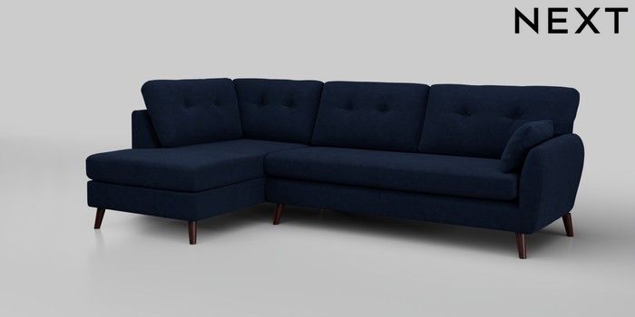 6.12.1 Buy Wilson Buttoned Back Large Corner Chaise - Left Hand Luxe Chenille Navy Blue Retro Tapered - Dark Brown from the Next UK online shop Click here to use our accessible website