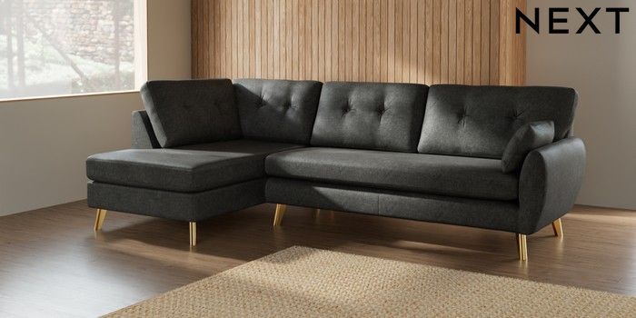 7.2.10 Buy Wilson Buttoned Back Large Corner Chaise - Left Hand Plush Chenille Dark Grey Metal Tapered - Gold from the Next UK online shop Click here to use our accessible website