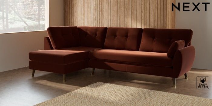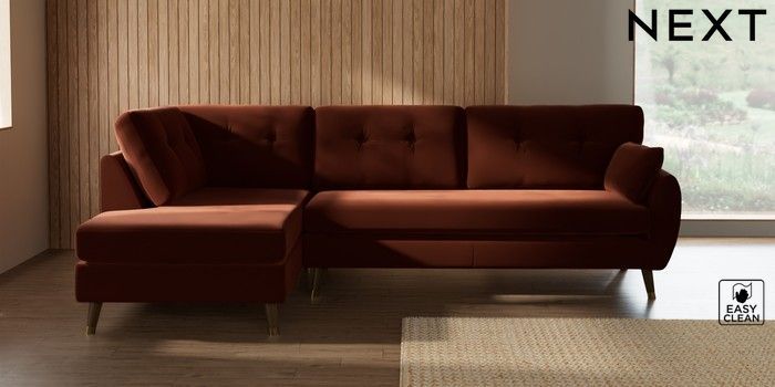 7.3.1 Buy Wilson Buttoned Back Large Corner Chaise - Left Hand Plush Velvet Easy Clean Ginger Orange Low Retro Tapered Metal Cap - Mid from the Next UK online shop Click here to use our accessible website