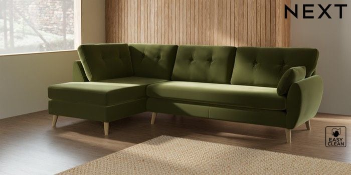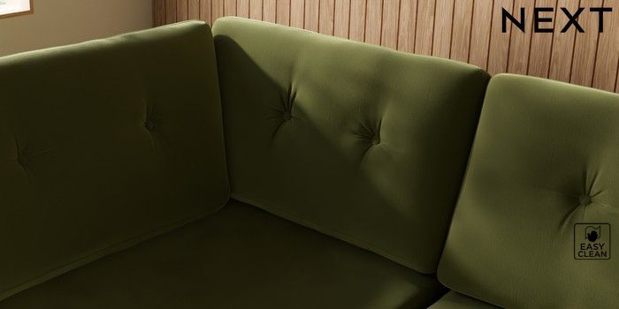 7.3.1 Buy Wilson Buttoned Back Large Corner Chaise - Left Hand Plush Velvet Easy Clean Mid Olive Green Retro Tapered - Light from the Next UK online shop Click here to use our accessible website