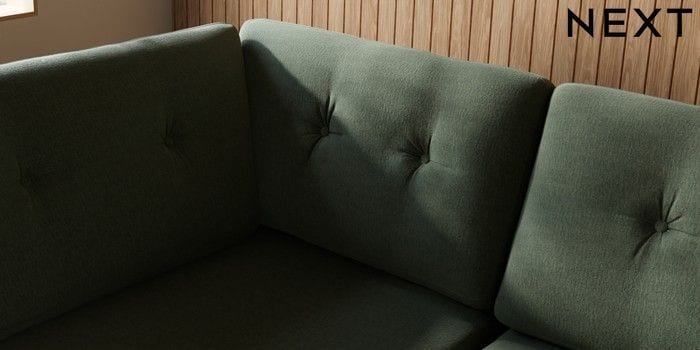 7.3.1 Buy Wilson Buttoned Back Large Corner Chaise - Left Hand Relaxed Linen Look Dark Green Metal Tapered - Gold from the Next UK online shop Click here to use our accessible website