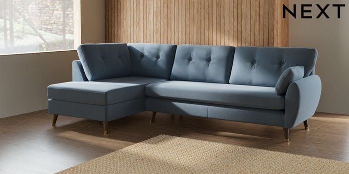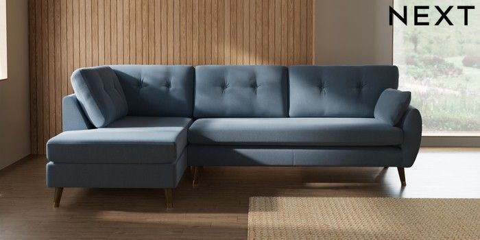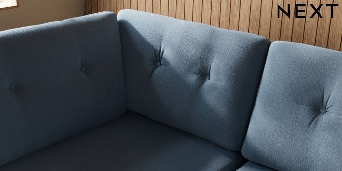 7.3.1 Buy Wilson Buttoned Back Large Corner Chaise - Left Hand Relaxed Linen Look Mid Blue Low Retro Tapered Metal Cap - Mid from the Next UK online shop Click here to use our accessible website