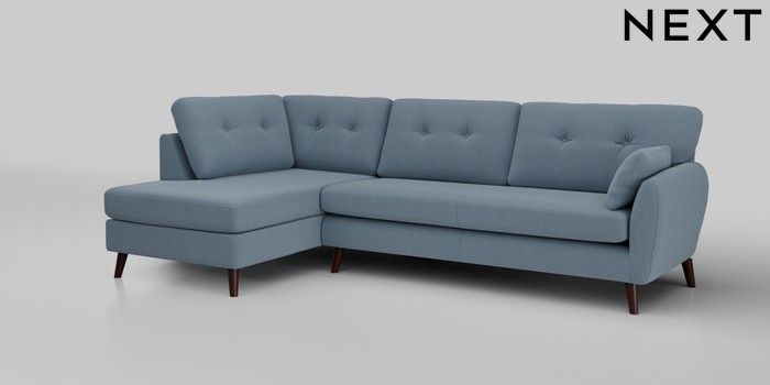6.12.1 Buy Wilson Buttoned Back Large Corner Chaise - Left Hand Relaxed Linen Look Mid Blue Retro Tapered - Dark Brown from the Next UK online shop Click here to use our accessible website