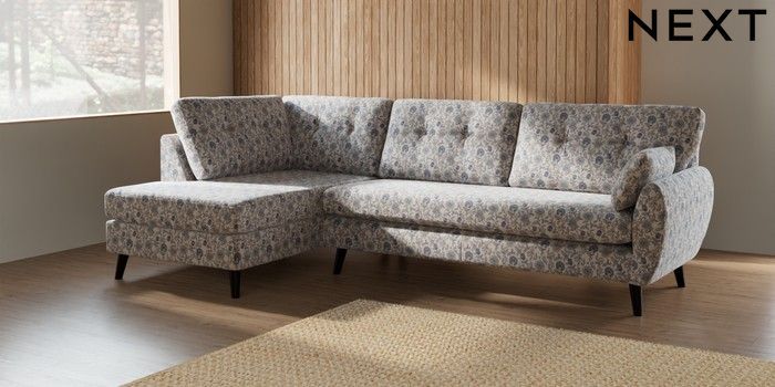 7.2.10 Buy Wilson Buttoned Back Large Corner Chaise - Left Hand Relaxed Linen Look Print Woodblock Floral Blue Retro Tapered - Dark from the Next UK online shop Click here to use our accessible website