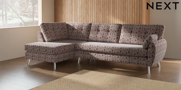 7.2.10 Buy Wilson Buttoned Back Large Corner Chaise - Left Hand Relaxed Linen Look Print Woodblock Floral Print Pink Metal Tapered - Chrome from the Next UK online shop Click here to use our accessible website