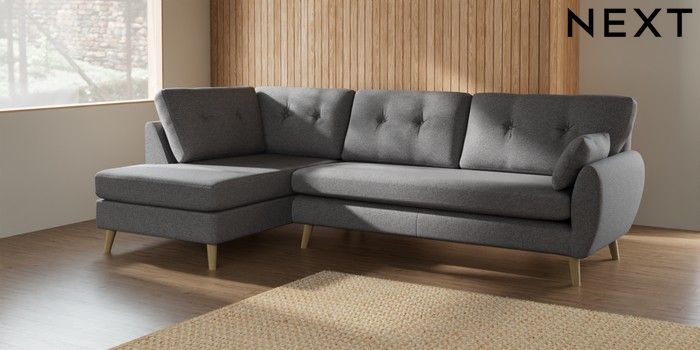 7.2.10 Buy Wilson Buttoned Back Large Corner Chaise - Left Hand Studio Chenille Mid Grey Retro Tapered - Light from the Next UK online shop Click here to use our accessible website