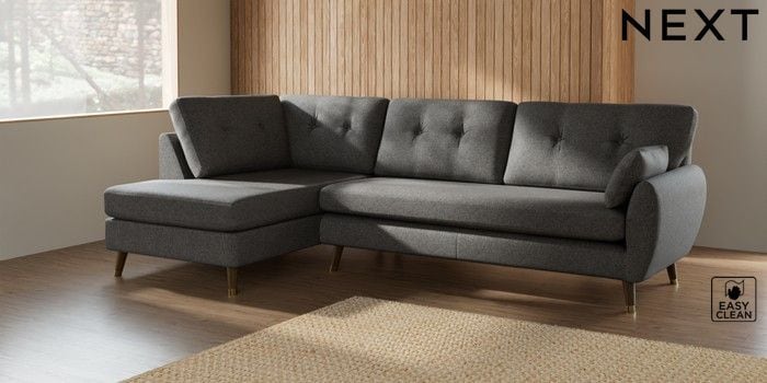 7.3.1 Buy Wilson Buttoned Back Large Corner Chaise - Left Hand Tweedy Blend Easy Clean Dark Grey Low Retro Tapered Metal Cap - Mid from the Next UK online shop Click here to use our accessible website