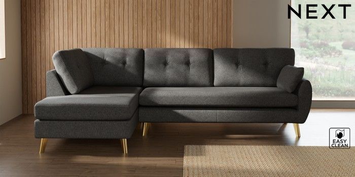 7.3.1 Buy Wilson Buttoned Back Large Corner Chaise - Left Hand Tweedy Blend Easy Clean Dark Grey Metal Tapered - Gold from the Next UK online shop Click here to use our accessible website