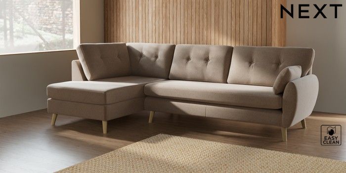 7.3.1 Buy Wilson Buttoned Back Large Corner Chaise - Left Hand Tweedy Blend Easy Clean Light Dove Natural Retro Tapered - Light from the Next UK online shop Click here to use our accessible website