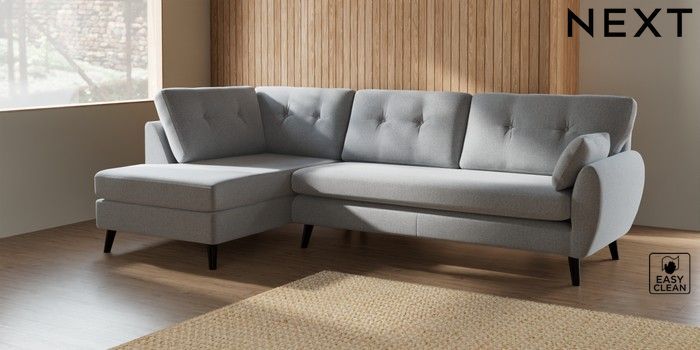 7.2.10 Buy Wilson Buttoned Back Large Corner Chaise - Left Hand Tweedy Blend Easy Clean Light Silver Grey Retro Tapered - Dark from the Next UK online shop Click here to use our accessible website