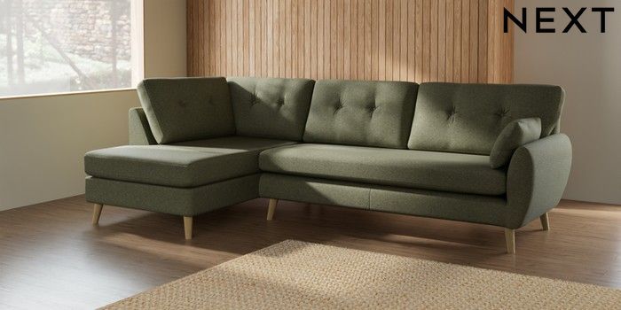 7.2.10 Buy Wilson Buttoned Back Large Corner Chaise - Left Hand Tweedy Chenille Mid Moss Green Retro Tapered - Light from the Next UK online shop Click here to use our accessible website