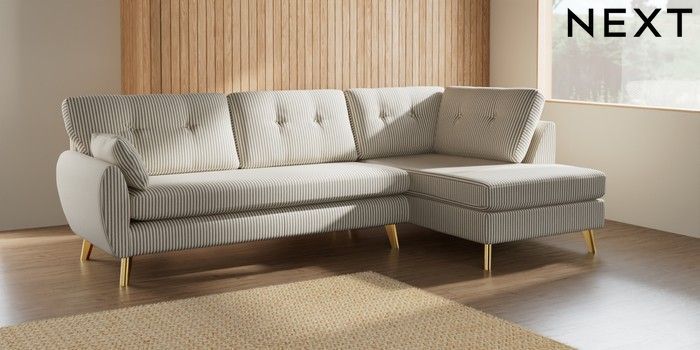 7.2.10 Buy Wilson Buttoned Back Large Corner Chaise - Right Hand Chenille Stripe Moss Green Metal Tapered - Gold from the Next UK online shop Click here to use our accessible website