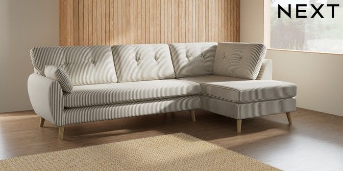 7.2.10 Buy Wilson Buttoned Back Large Corner Chaise - Right Hand Chenille Stripe Moss Green Retro Tapered - Light from the Next UK online shop Click here to use our accessible website