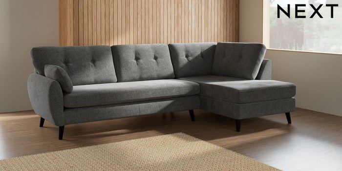 7.2.10 Buy Wilson Buttoned Back Large Corner Chaise - Right Hand Chunky Chenille Dark Grey Retro Tapered - Dark from the Next UK online shop Click here to use our accessible website
