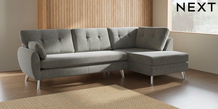 7.3.1 Buy Wilson Buttoned Back Large Corner Chaise - Right Hand Chunky Chenille Light Grey Metal Tapered - Chrome from the Next UK online shop Click here to use our accessible website