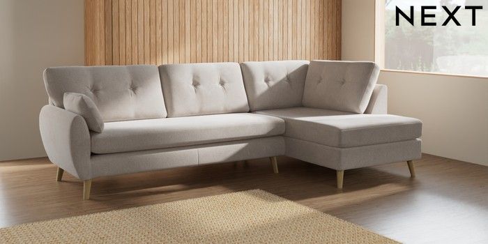 7.2.10 Buy Wilson Buttoned Back Large Corner Chaise - Right Hand Chunky Chenille Oyster Retro Tapered - Light from the Next UK online shop Click here to use our accessible website