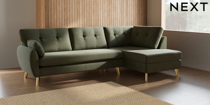 7.2.10 Buy Wilson Buttoned Back Large Corner Chaise - Right Hand Ripple Chenille Mid Moss Green Metal Tapered - Gold from the Next UK online shop Click here to use our accessible website