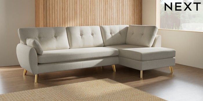 7.3.1 Buy Wilson Buttoned Back Large Corner Chaise - Right Hand Chunky Texture Oyster Metal Tapered - Gold from the Next UK online shop Click here to use our accessible website