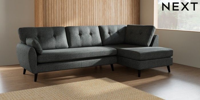 7.2.10 Buy Wilson Buttoned Back Large Corner Chaise - Right Hand Cotswold Chenille Dark Grey Retro Tapered - Dark from the Next UK online shop Click here to use our accessible website