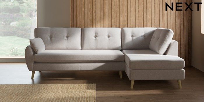 7.3.1 Buy Wilson Buttoned Back Large Corner Chaise - Right Hand Cotswold Chenille Oyster Retro Tapered - Light from the Next UK online shop Click here to use our accessible website