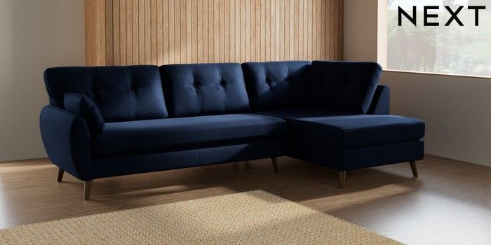 7.2.10 Buy Wilson Buttoned Back Large Corner Chaise - Right Hand Luxe Chenille Navy Blue Retro Tapered - Mid from the Next UK online shop Click here to use our accessible website