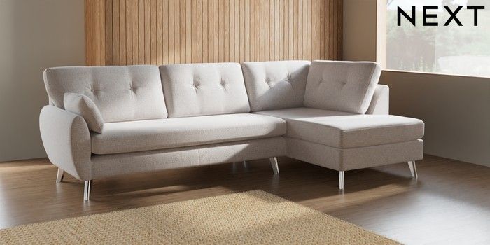 7.2.6 Buy Wilson Buttoned Back Large Corner Chaise - Right Hand Multi Weave Oyster Metal Tapered - Chrome from the Next UK online shop Click here to use our accessible website