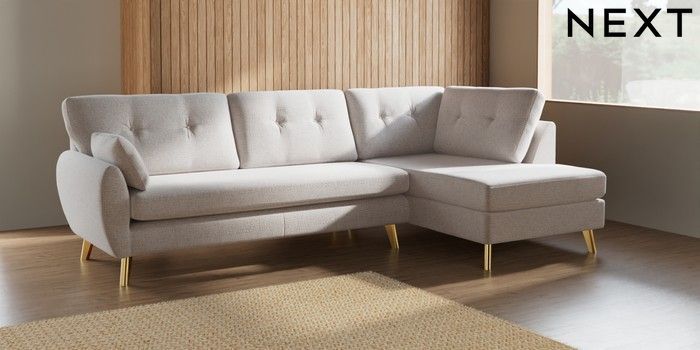 7.2.6 Buy Wilson Buttoned Back Large Corner Chaise - Right Hand Multi Weave Oyster Metal Tapered - Gold from the Next UK online shop Click here to use our accessible website