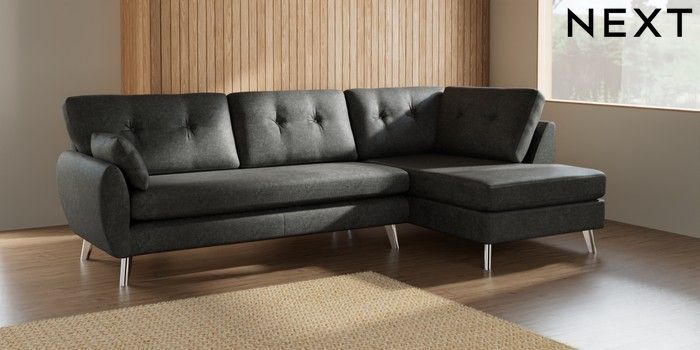 7.3.1 Buy Wilson Buttoned Back Large Corner Chaise - Right Hand Plush Chenille Dark Grey Metal Tapered - Chrome from the Next UK online shop Click here to use our accessible website