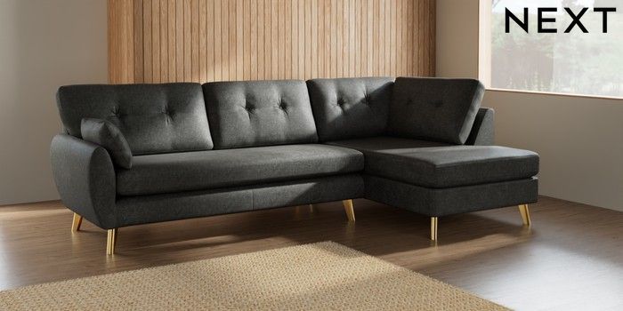 7.3.1 Buy Wilson Buttoned Back Large Corner Chaise - Right Hand Plush Chenille Dark Grey Metal Tapered - Gold from the Next UK online shop Click here to use our accessible website