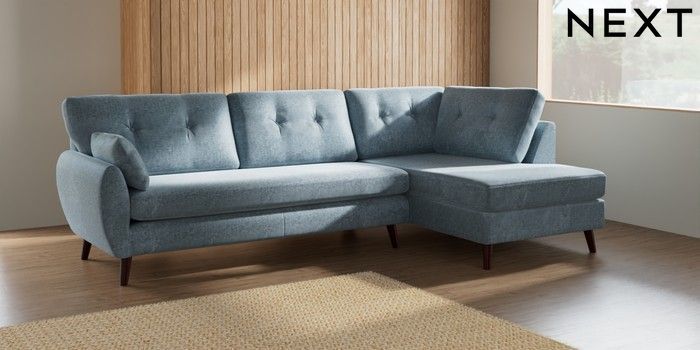 7.2.6 Buy Wilson Buttoned Back Large Corner Chaise - Right Hand Plush Chenille Light Blue Retro Tapered - Dark Brown from the Next UK online shop Click here to use our accessible website