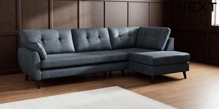 7.3.1 Buy Wilson Buttoned Back Large Corner Chaise - Right Hand Plush Chenille Slate Blue Retro Tapered - Dark from the Next UK online shop Click here to use our accessible website