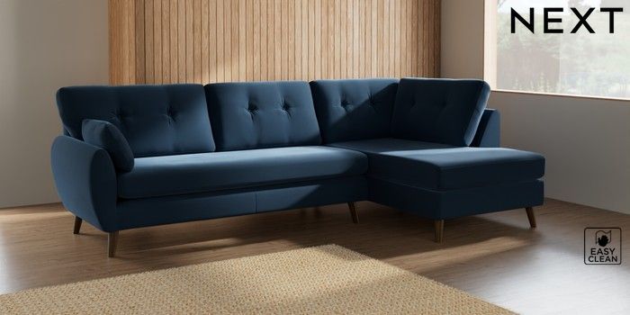 7.3.1 Buy Wilson Buttoned Back Large Corner Chaise - Right Hand Plush Velvet Easy Clean Airforce Blue Retro Tapered - Mid from the Next UK online shop Click here to use our accessible website