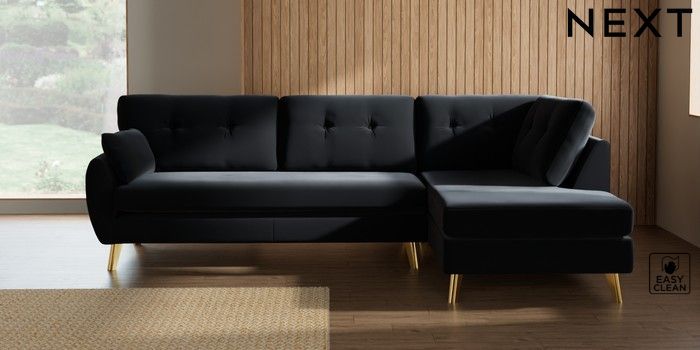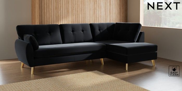 7.3.1 Buy Wilson Buttoned Back Large Corner Chaise - Right Hand Plush Velvet Easy Clean Charcoal Grey Metal Tapered - Gold from the Next UK online shop Click here to use our accessible website