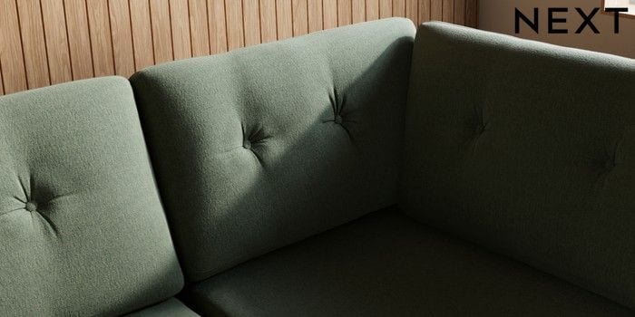 7.3.1 Buy Wilson Buttoned Back Large Corner Chaise - Right Hand Relaxed Linen Look Dark Green Metal Tapered - Chrome from the Next UK online shop Click here to use our accessible website