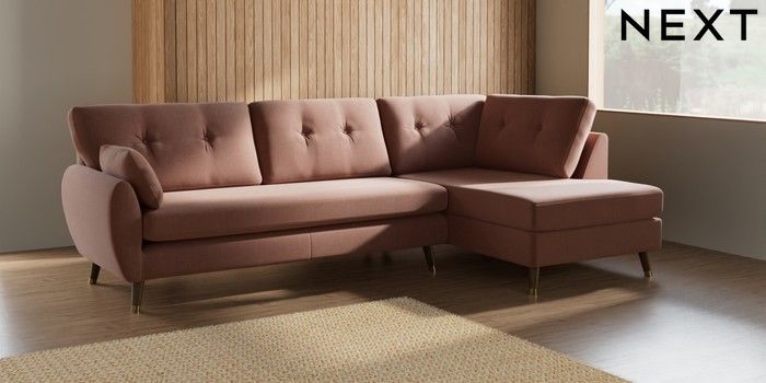 7.3.1 Buy Wilson Buttoned Back Large Corner Chaise - Right Hand Relaxed Linen Look Light Rust Brown Low Retro Tapered Metal Cap - Mid from the Next UK online shop Click here to use our accessible website
